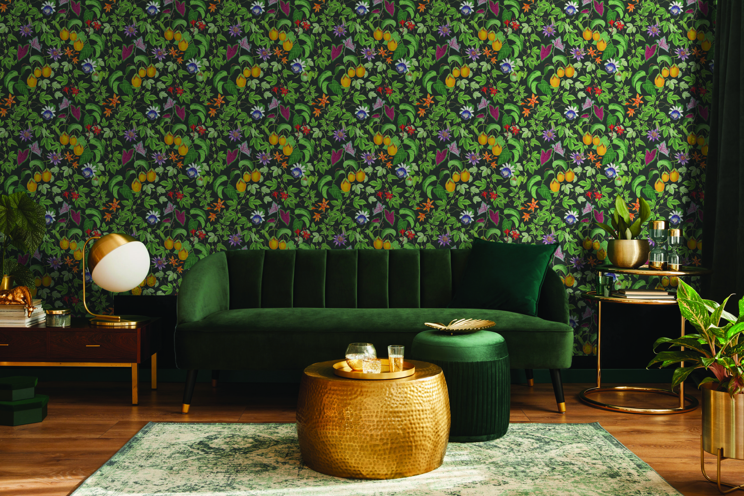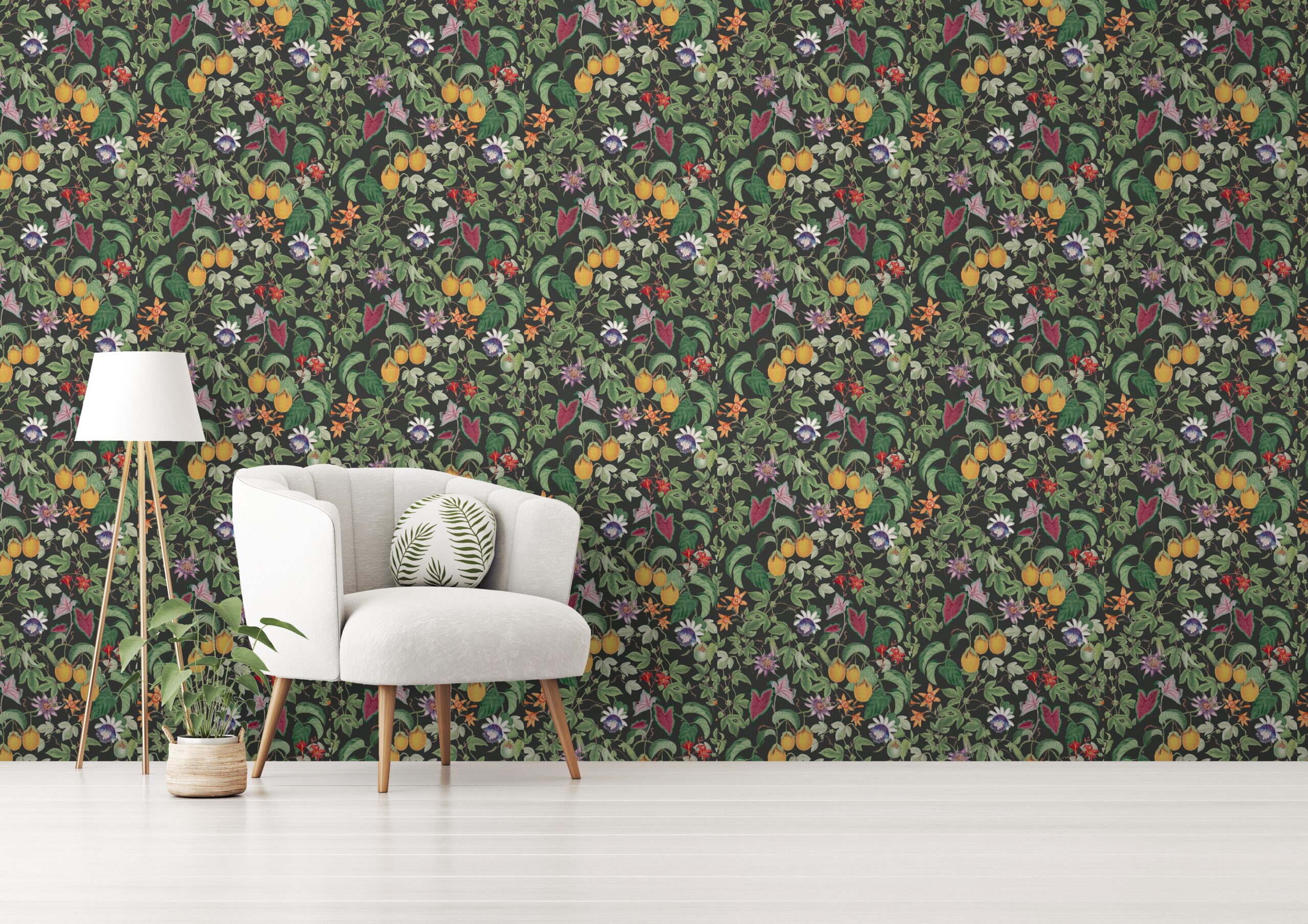 This bold choice creates a striking contrast, amplifying the vibrant colours of the passion flowers, citrus fruits, and lush leaves. This design brings a touch of sophisticated elegance to any space. Paste-the-wall application method for easy hanging.