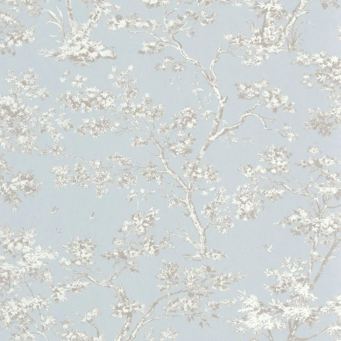 Bring the calm of nature into your home with Casadeco Les Belles Toiles de Jouy 2 Arbre Taupe / Bleu Doux wallpaper. Inspired by the trees of the Fontainebleau forest, this design shows tall tree shapes that add a peaceful and classic touch to any room. The soft taupe and light blue colors create a soothing look that works well with both modern and traditional décor.