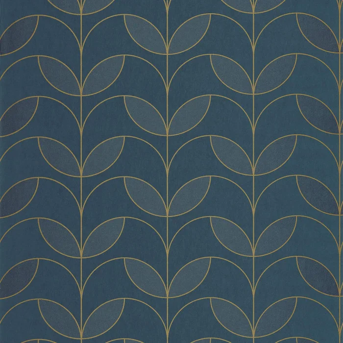 The rich bleu pétrole background highlights tiara-like motifs that shimmer with timeless charm. In addition, the contrast of blue and metallic tones creates a refined atmosphere, making this art deco wallpaper suitable for both bold feature walls and full-room styling.