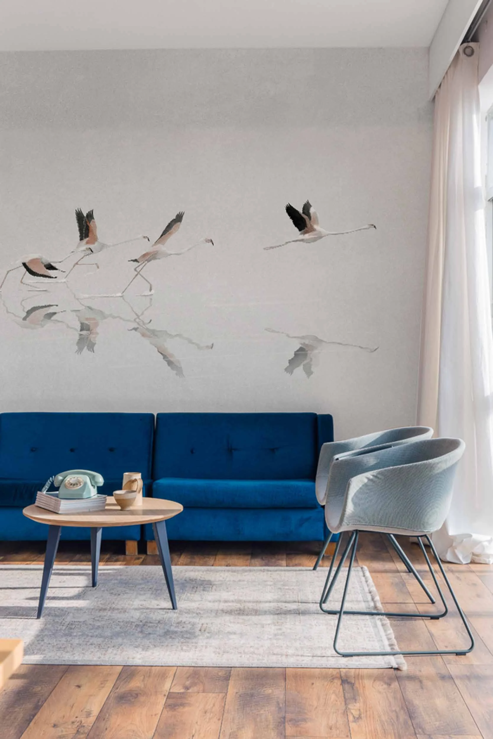 The Coordonné Aracne Doñana Linen - Sky wallpaper brings the calming beauty of nature into your home. Inspired by a family of flamingos taking flight at dawn, the design captures both the excitement and peacefulness of their journey. The soft, sky-blue tones create a serene atmosphere, transforming your space into a tranquil retreat that feels like a protected natural area.