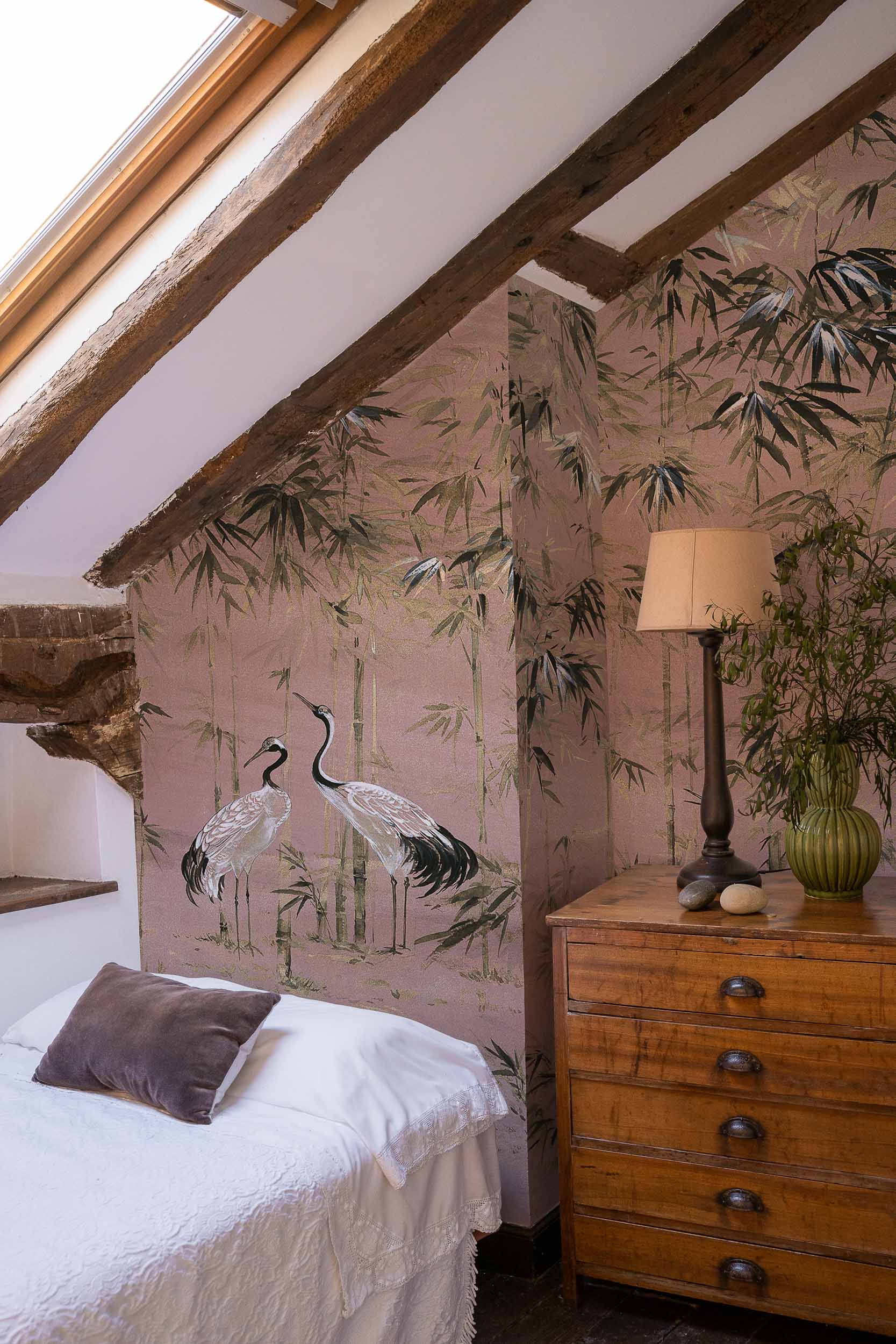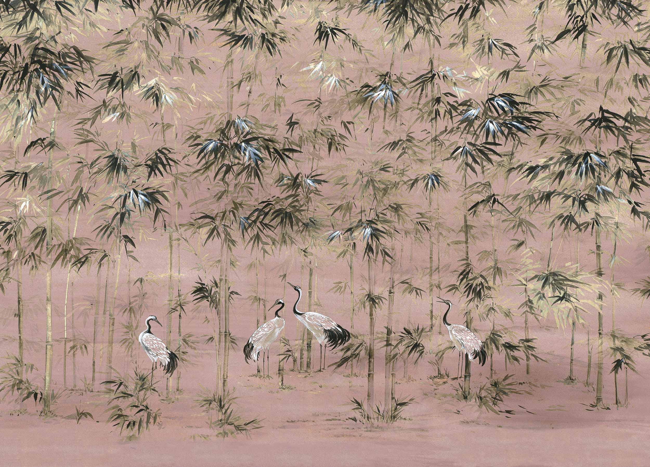 The Coordonné Aracne Garzas Linen - Nude Rosa wallpaper brings a peaceful, dreamy feel to your room. Inspired by birds flying between slender bamboo, it captures the calm beauty of nature at dusk. The soft nude rosa tones, along with the detailed birds and bamboo, add a touch of elegance and luxury to your space.