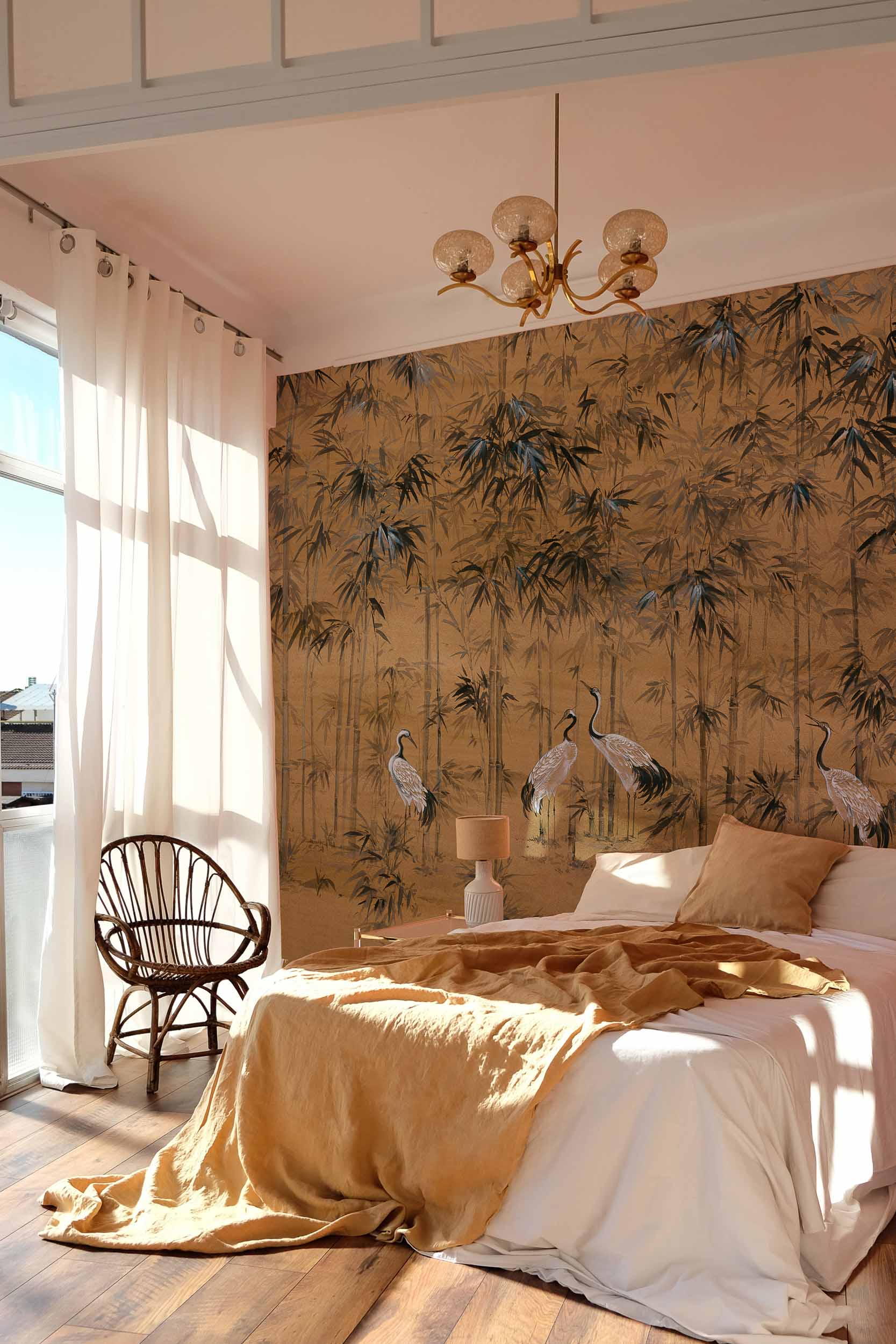 The Coordonné Aracne Garzas Silk - Ocher wallpaper transforms your home into a peaceful retreat. Inspired by birds flying gently among bamboo, it brings the calm of dusk indoors. The warm ocher tones add depth and create a relaxed, welcoming atmosphere that’s perfect for any room.