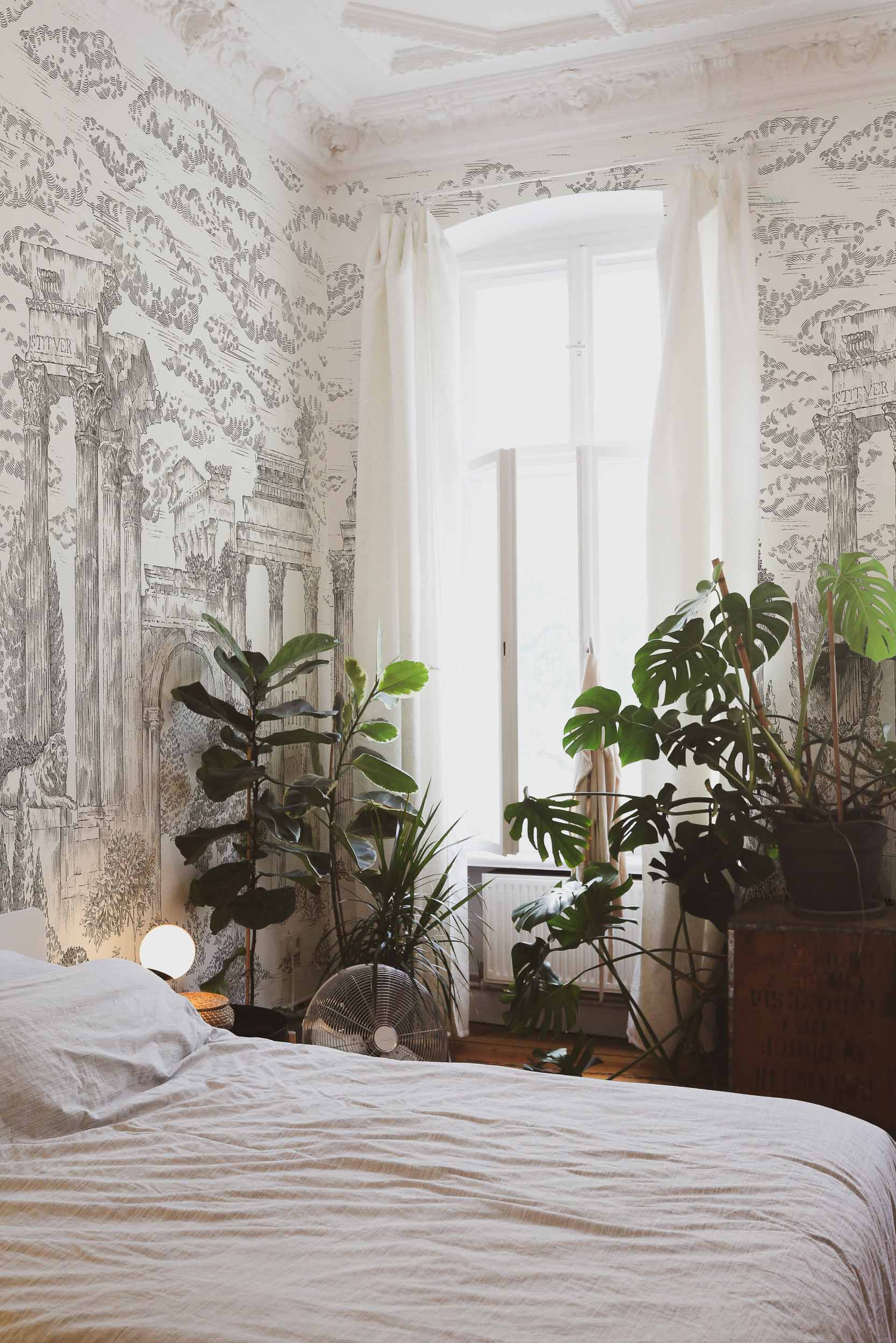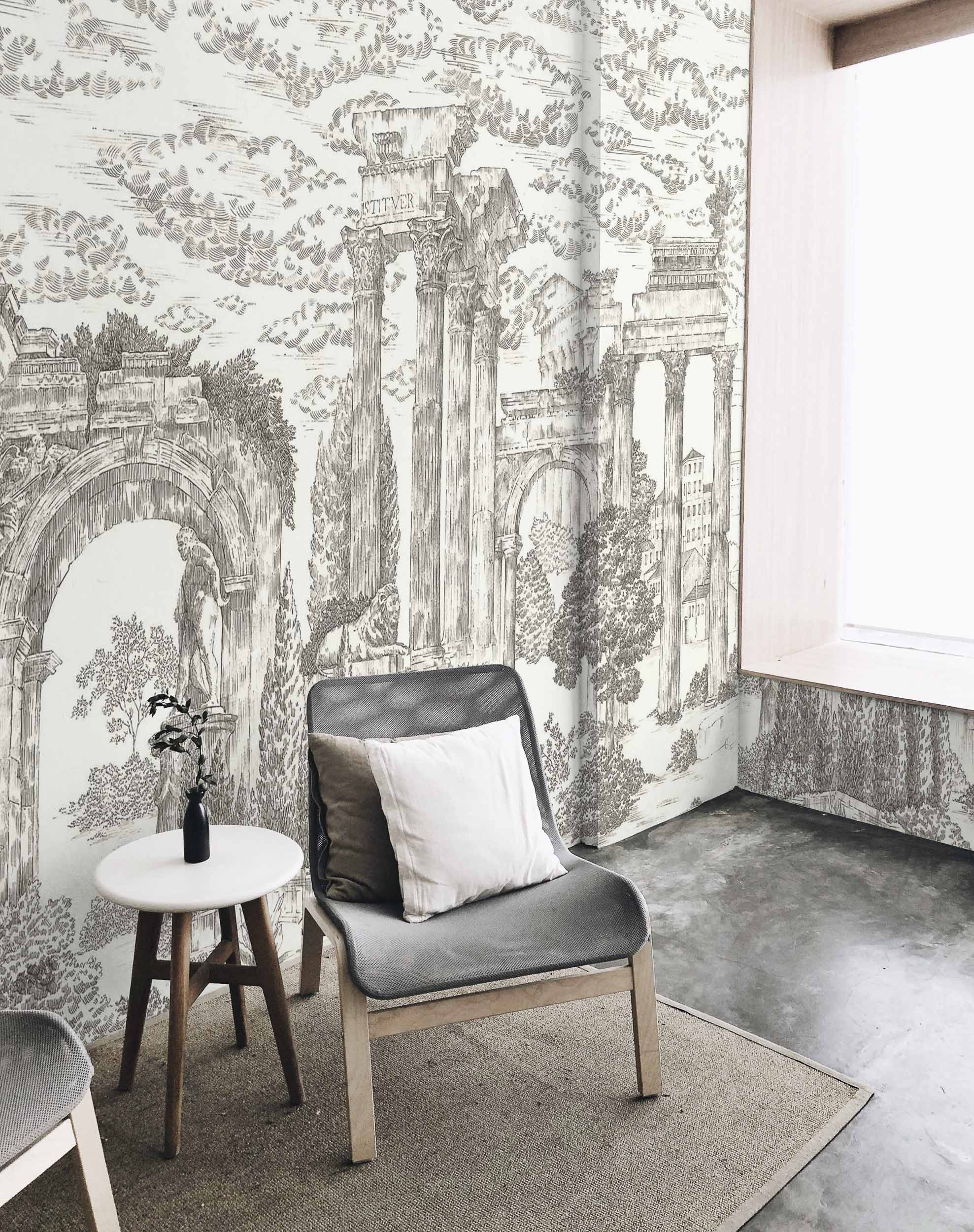 Transform your home with Coordonné Aracne Ruins Linen - Graphite, a stunning wallpaper inspired by a dreamlike Greco-Roman landscape. This design combines the decay of ancient ruins with the beauty of nature’s resilience, as overgrown vegetation intertwines with crumbling columns and arches. The deep graphite tones add a sophisticated and modern feel, making it an ideal choice for creating a dramatic feature wall.