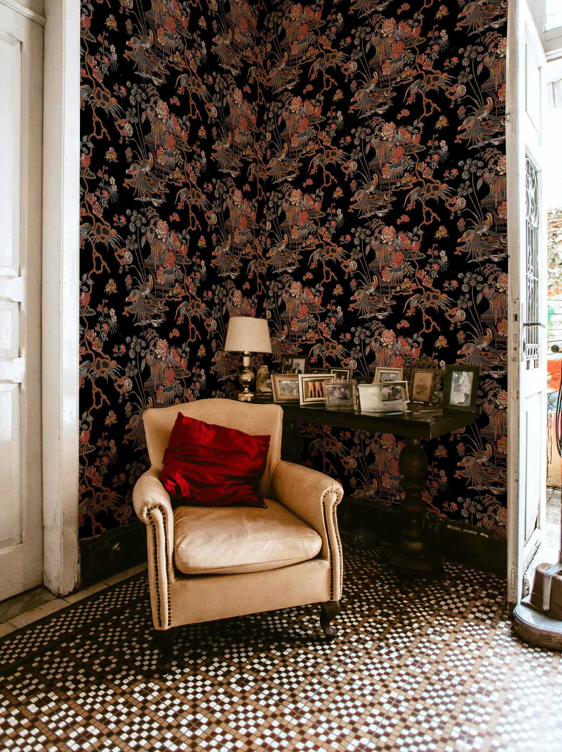 Enhance your space with the Coordonné Sacred Pheasants Onyx wallpaper, a design inspired by the beauty of imperial feasts. This luxurious black wallpaper features delicate pheasant plumage, symbolizing prosperity, power, and grace. The deep, dark background highlights the intricate bird details, creating a stunning contrast that brings depth and elegance to any room. Because of its classic yet bold look, it works well in both modern and traditional interiors.