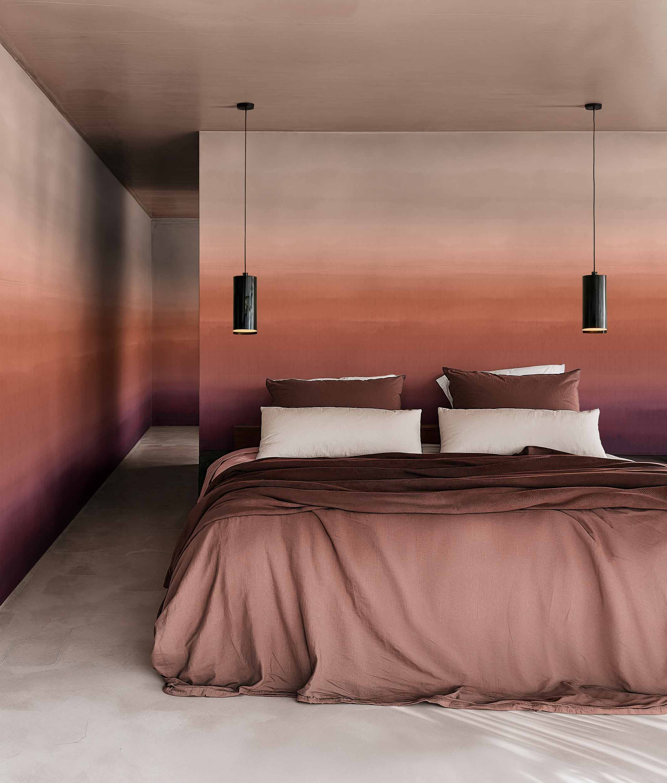Inspired by the gentle beauty of daybreak, the Hinode Prune Mural by Coordonné brings soft morning light indoors.