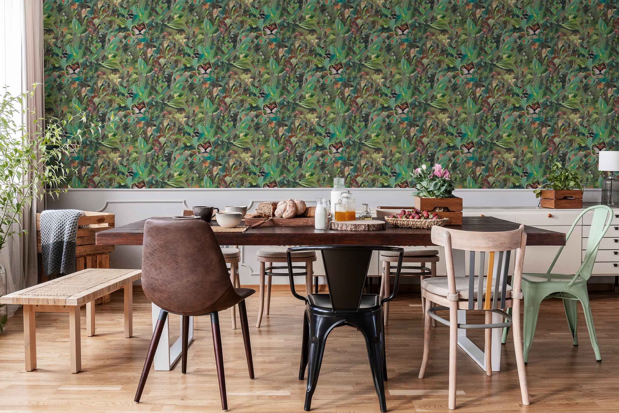 Bring the vibrancy of spring into your home with Coordonné Naturae Hidden Puma - Spring wallpaper. Designed in rich green tones, this wallpaper features a hidden puma subtly integrated into the pattern, adding depth and intrigue to your space. Inspired by lush greenery, this design creates a refreshing and calming atmosphere, perfect for any interior.