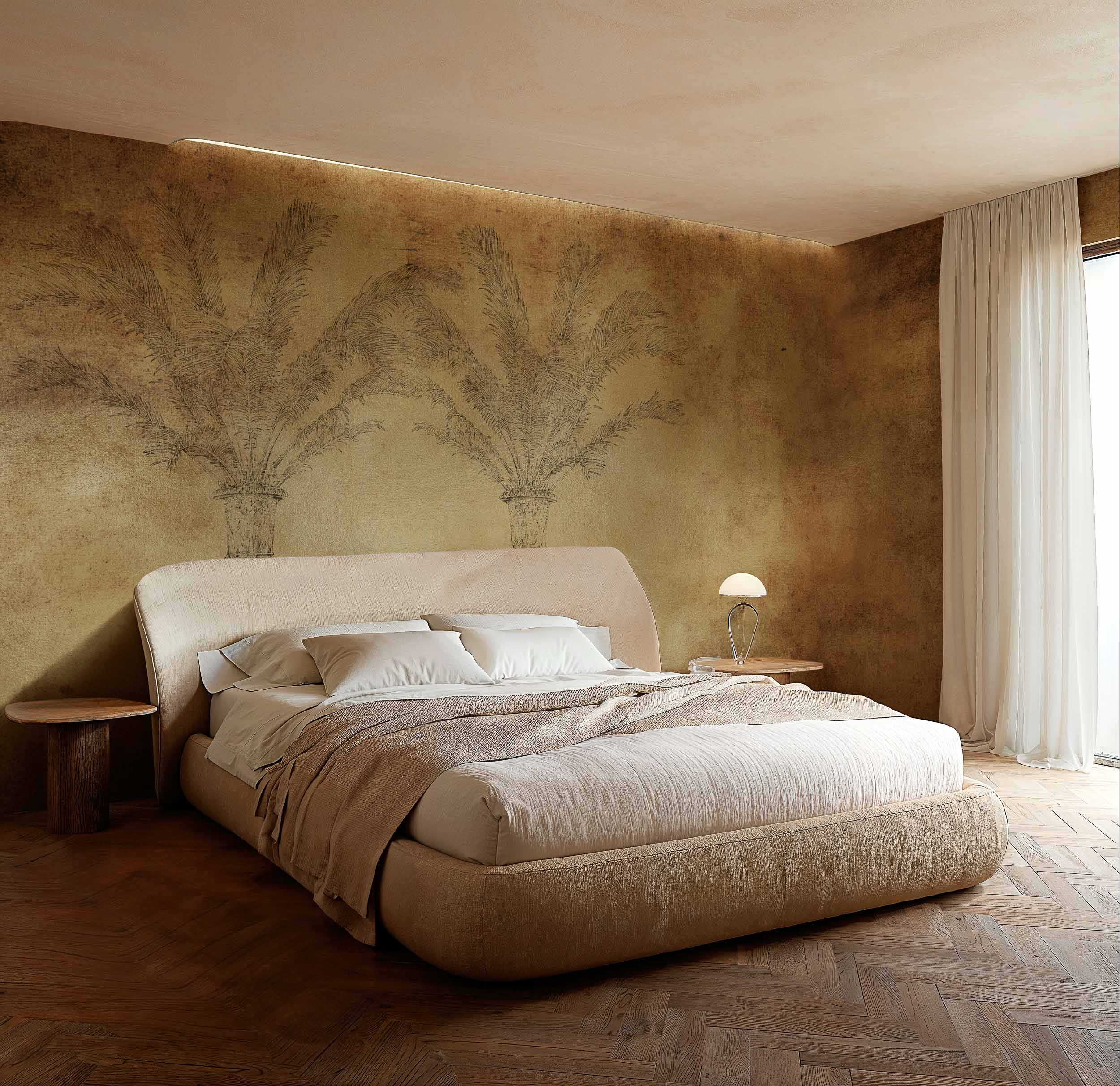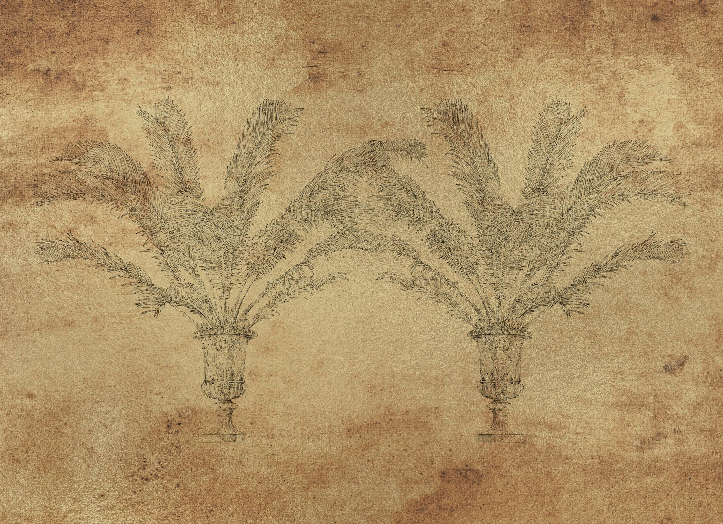 • Warm gold vegetal wallpaper with palm fronds and Roman pitcher artwork