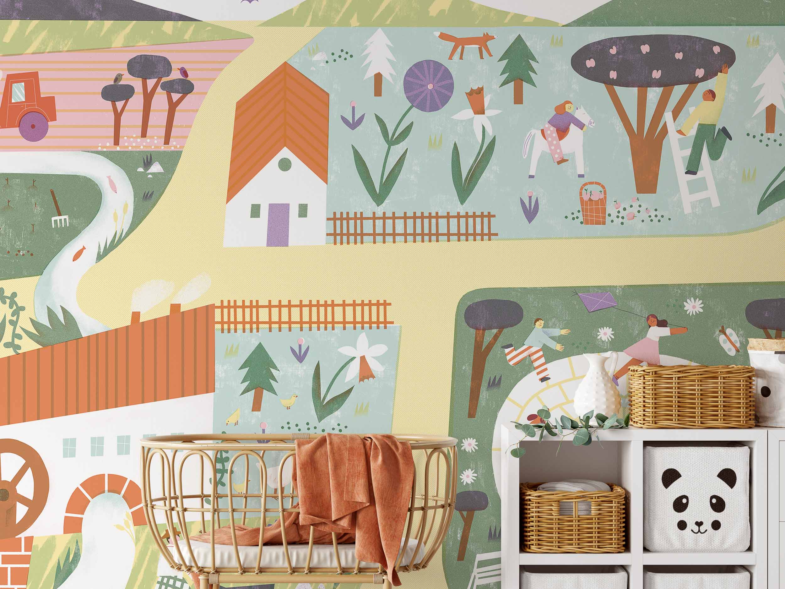 Transform your child's room into a bright and playful haven with the Coordonné Random Kids Country Joy - Lemon Mural. Featuring a charming countryside landscape in warm yellow and orange tones, this design brings a sense of joy and tranquility. Inspired by sunlit fields and open meadows, it adds warmth while fostering creativity.