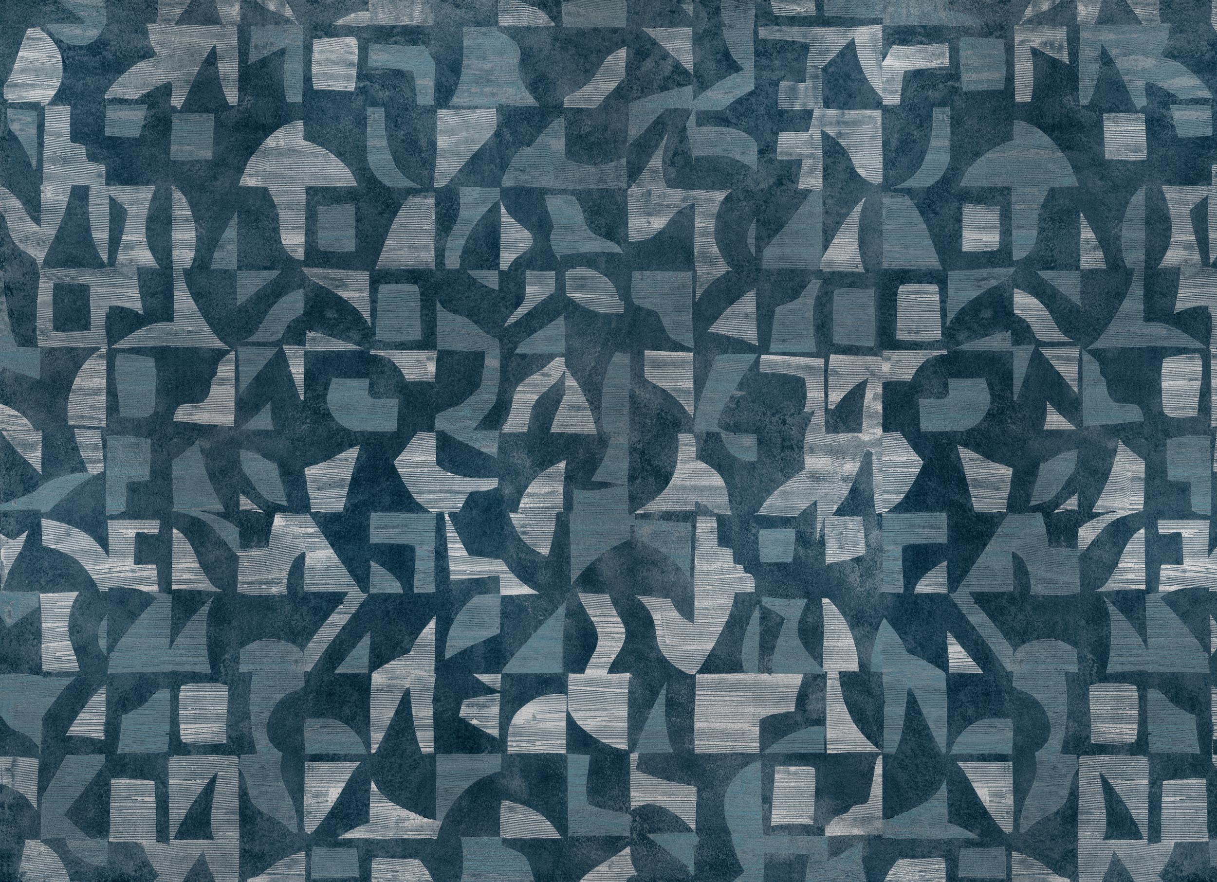 Shades of deep navy blue provide a grounding base, while soft silver lines shimmer across the surface. This contrast creates depth and interest without overwhelming your space. Thanks to its soothing colour palette and reflective finish, this metallic wallcovering adds quiet sophistication to any room.