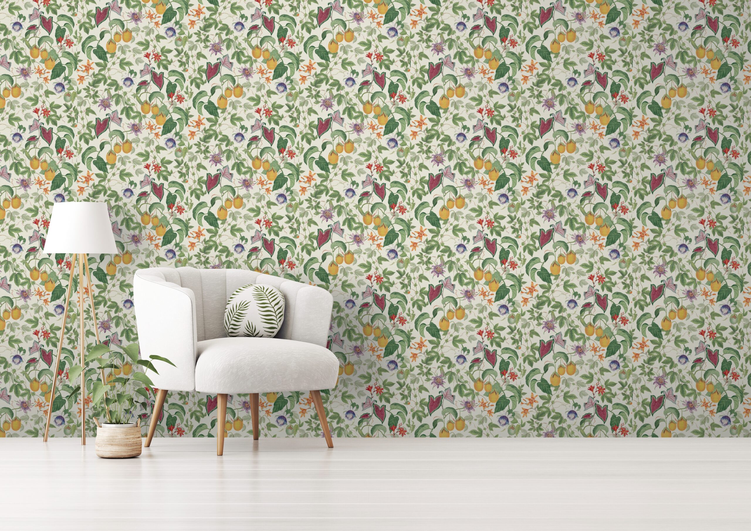 Esselle Home RHS-Citrus & Vine Cream Wallpaper is inspired by the lush foliage and vibrant fruits of a tropical paradise, the RHS Citrus & Vine Cream Wallpaper features a captivating mix of passion flowers, citrus fruits, and lush leaves on a soft cream background.