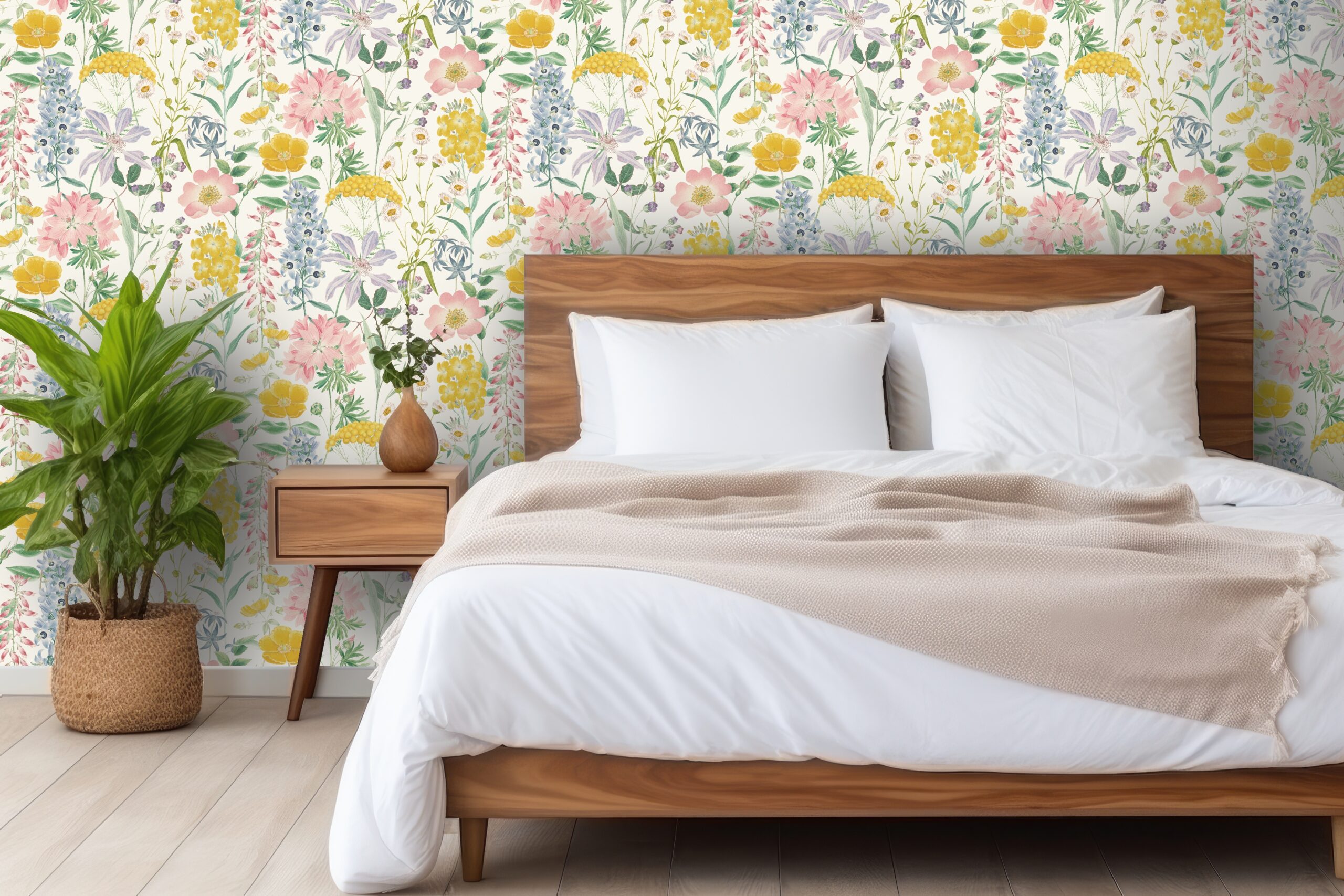 This RHS Country Garden Cream Wallpaper features a charming mix of garden flowers in vibrant hues, bringing the beauty of a British garden into any room. The cheerful display of daisies, clematis, and other blooms creates a warm and inviting atmosphere.