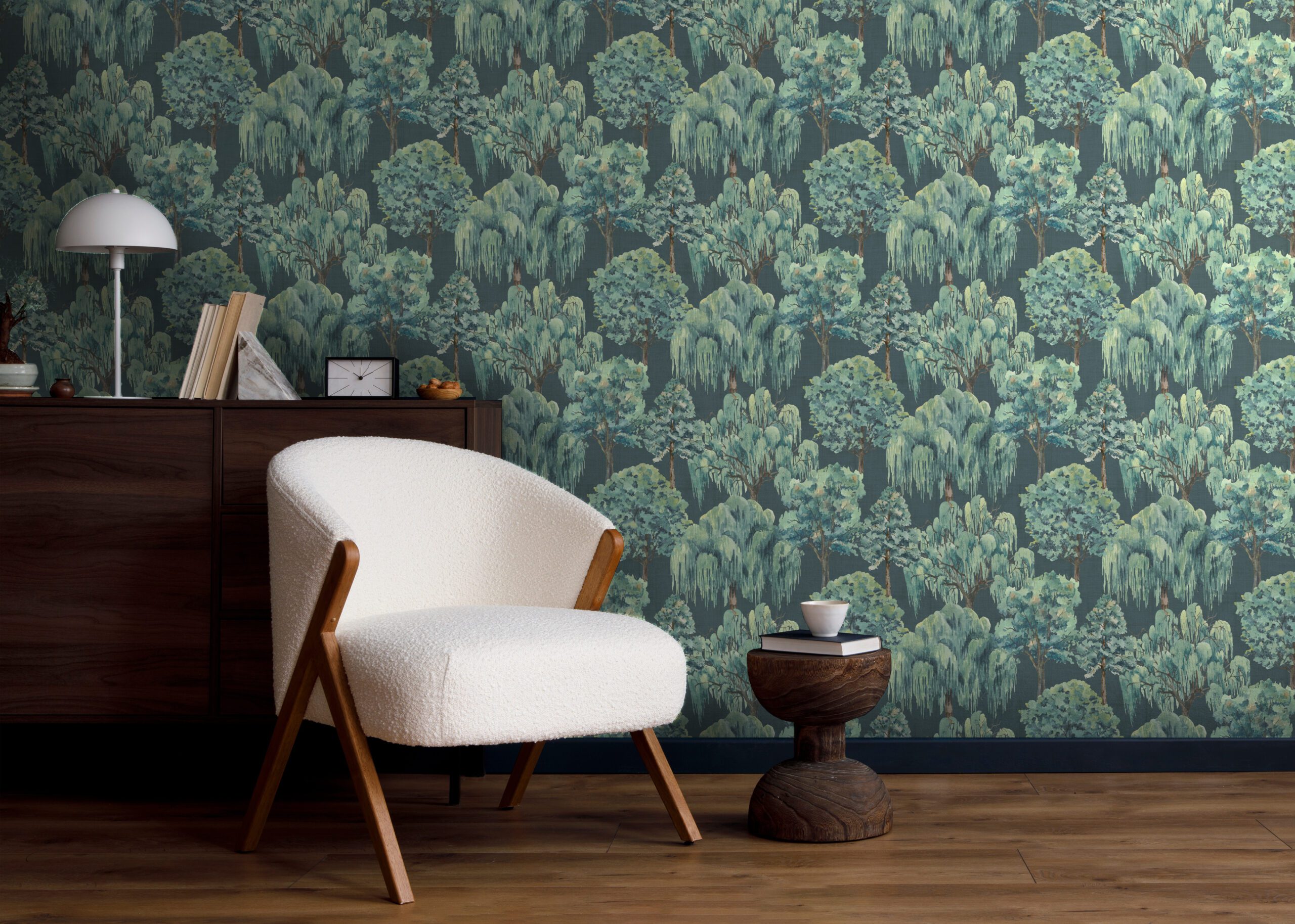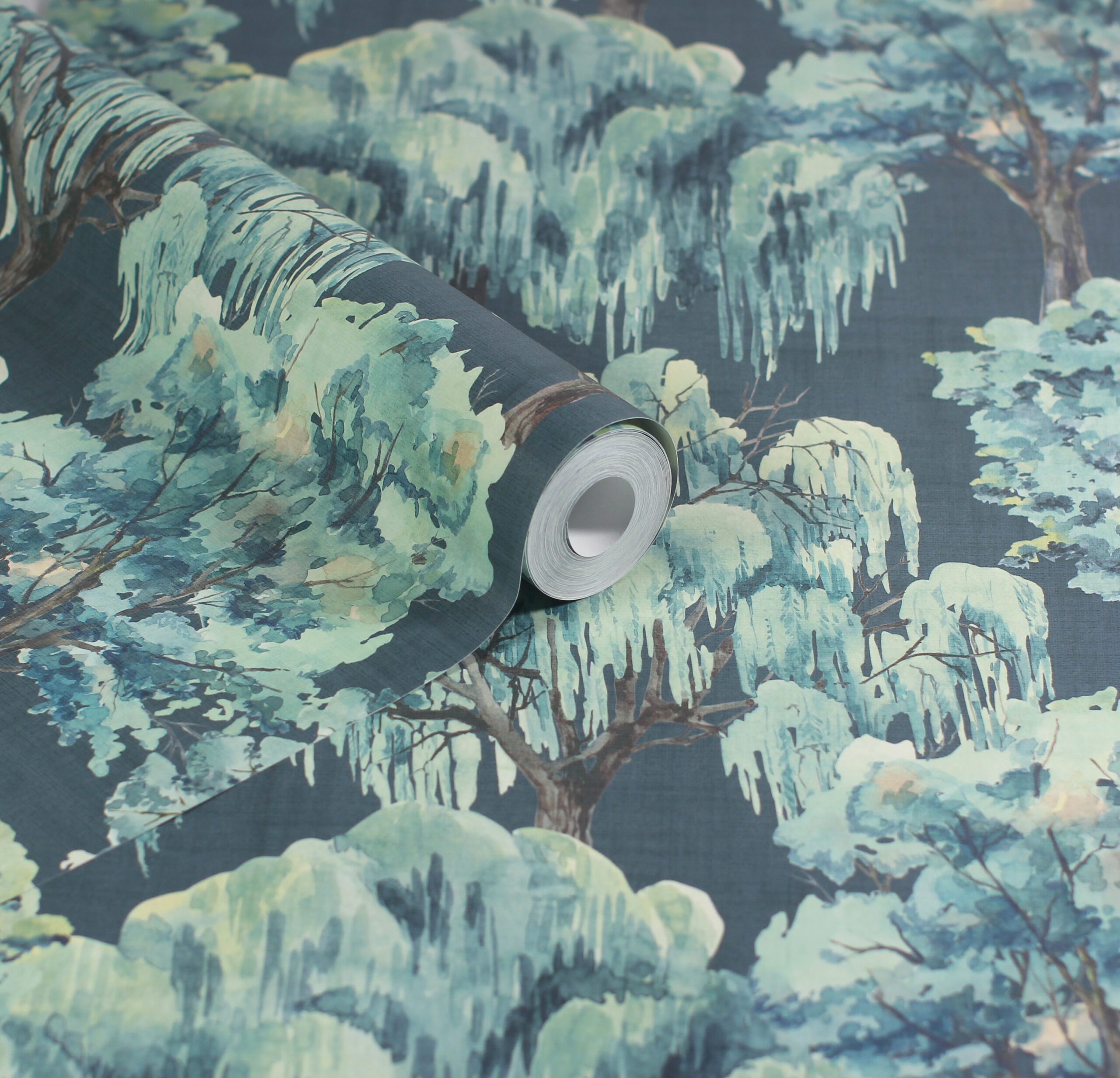 Esselle Home’s Whispering Willow Navy Wallpaper brings the charm of the English countryside into your home. Hand-painted in soft watercolors, this design features graceful trees that stretch across your walls. The tranquil scene evokes cottages nestled among rolling hills, creating a serene woodland atmosphere in any room. This Whispering Willow wallpaper is ideal for those seeking a nature-inspired design that transforms any space.