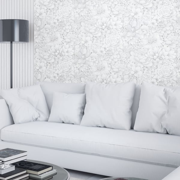 A stylish floral wallpaper with a wealth of detail. Three dimensional flowers erupt in a layered feast of large peonies , apple blossoms, orchids and roses. Whether your home is traditional or modern, this wallpaper in various shades of grey will complement your space to perfection. The beauty of this vinyl wallpaper is not only will it add texture to your walls, but it will also cover slight imperfections, giving your room the finish you want. So whether you are looking for a floral wallpaper for a living room, bedroom or dining room, this paper could be your perfect choice.