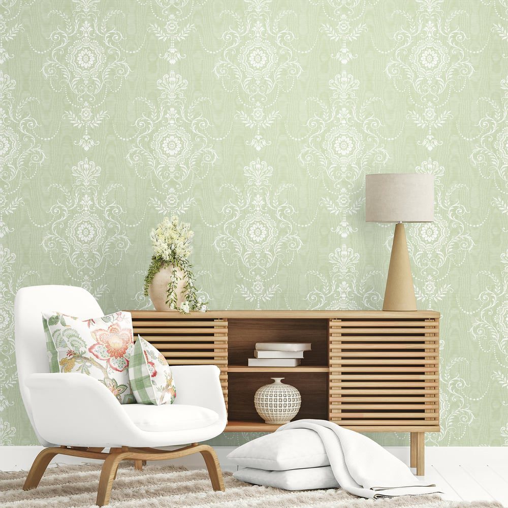 A take on a traditional Jacobean design where Moire effect silk imitation in a neutral beige forms the perfect backdrop for a delicate Cream floral damask design.