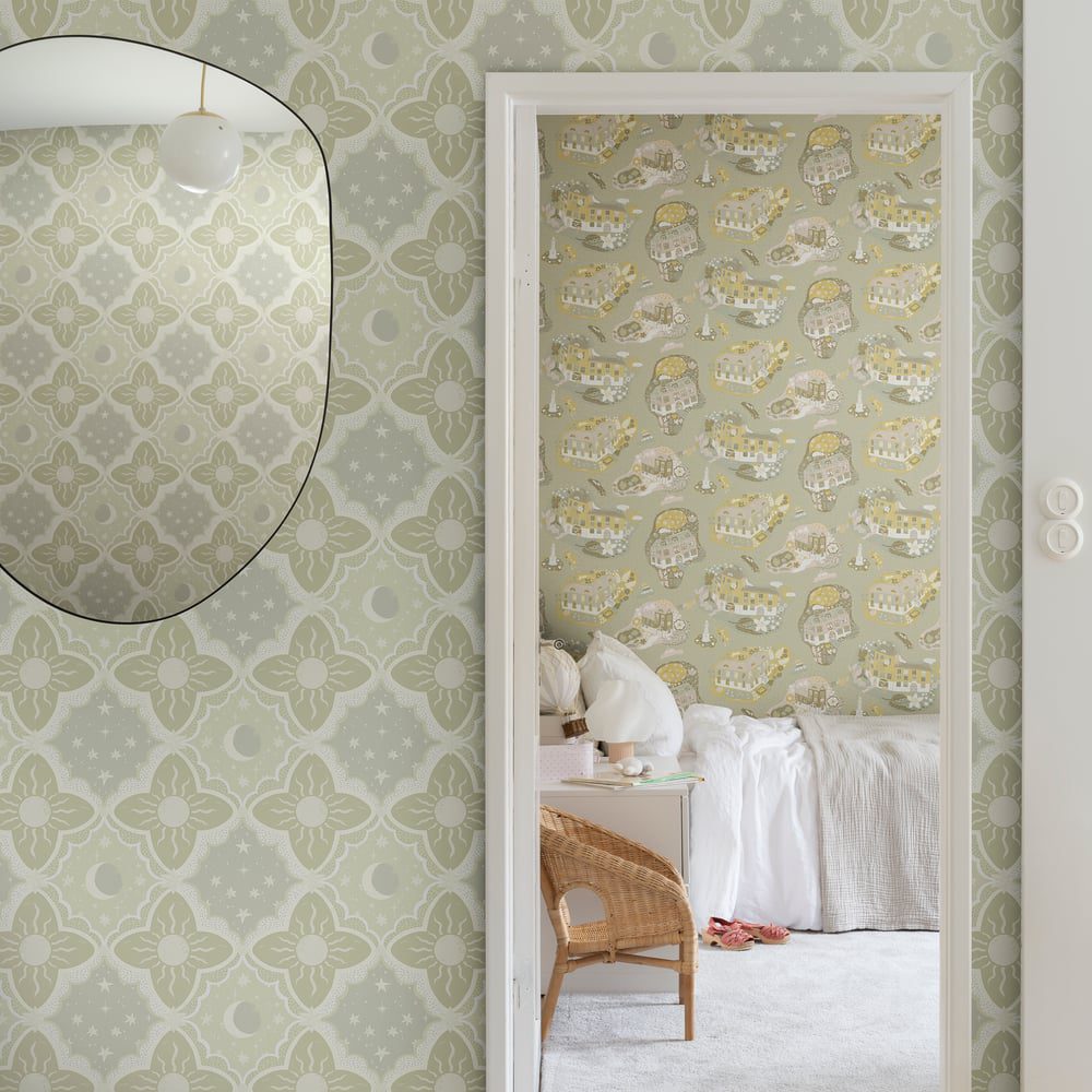 Bring balance and beauty to your walls with Galerie Wallcoverings Resan 29033. This geometric wallpaper is inspired by the contrasting forces of the sun and the moon. It blends clean, structured lines with graceful curves, forming a harmonious pattern that feels both modern and timeless.