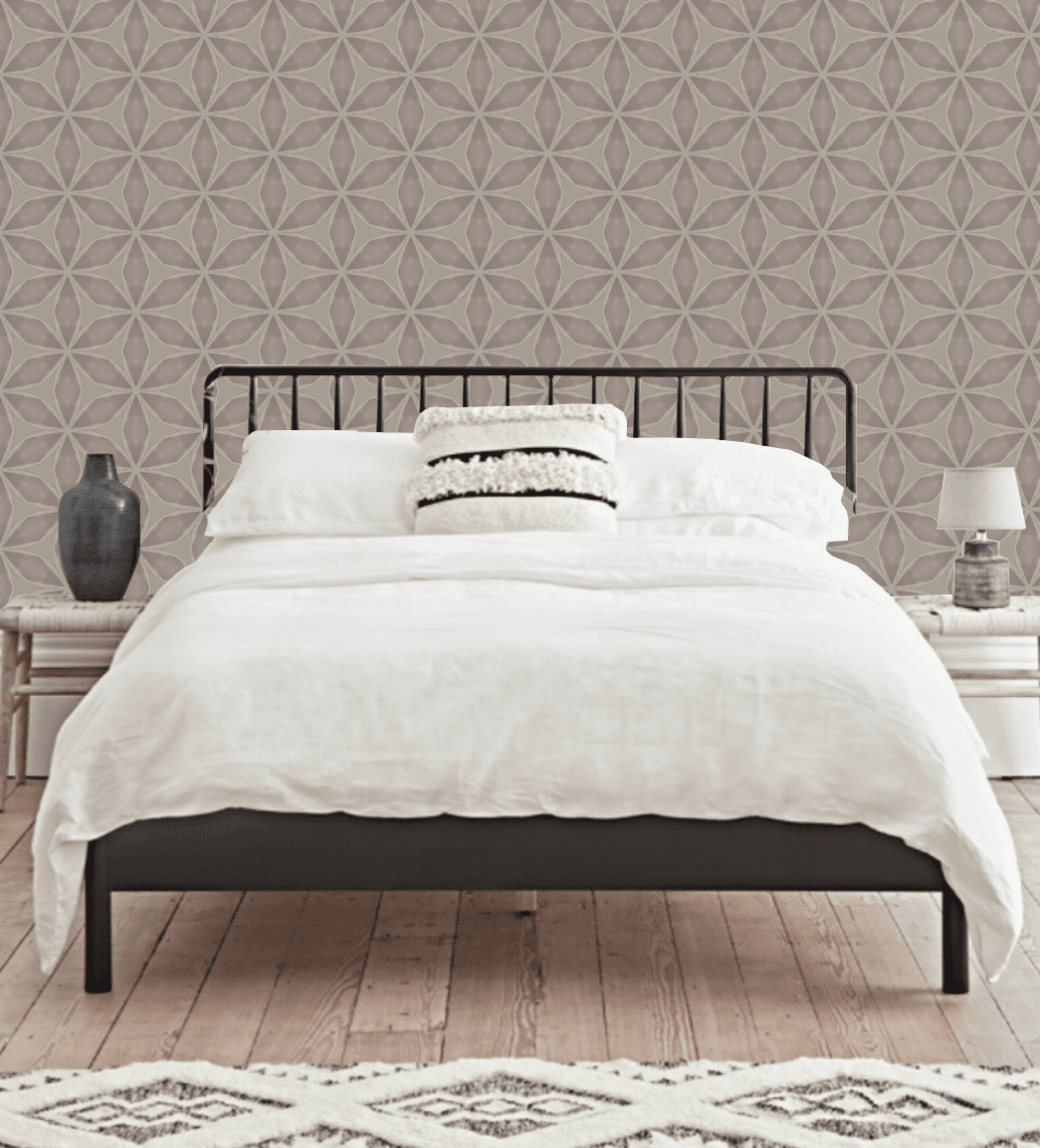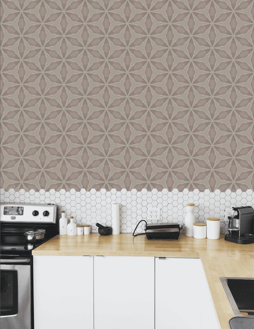 This wallpaper is ideal for natural interiors. It pairs wonderfully with raw wood surfaces, enhancing the peaceful atmosphere. Additionally, its gentle tones make it perfect for living rooms, bedrooms, and hallways, creating a serene ambiance. The geometric design adds a modern touch, while the warm colors maintain elegance. Whether your style is contemporary or more traditional, this design will suit your space.