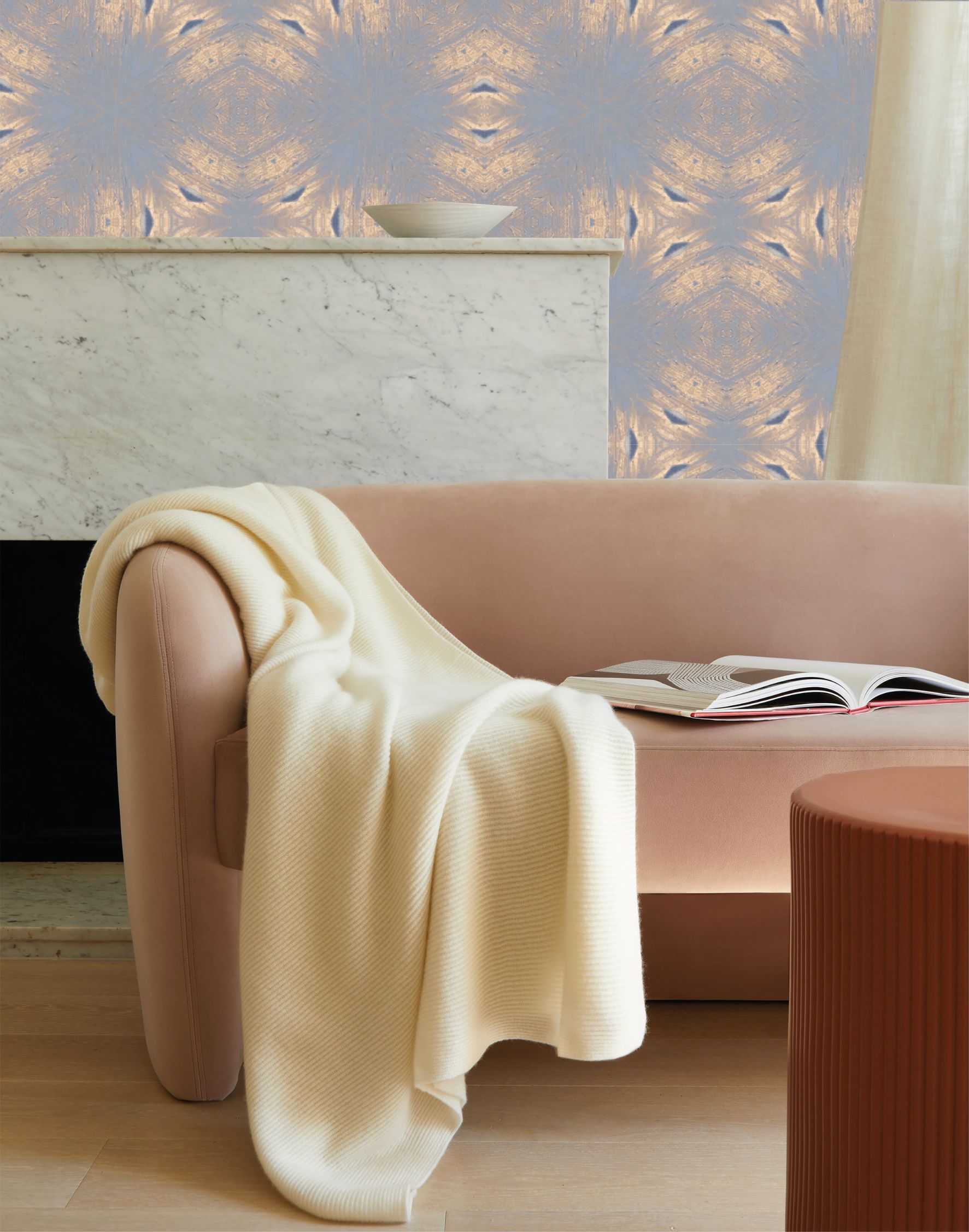 Julia Clare Etherea Mirage Blue Gold wallpaper offers a calming blend of blues and gold. Inspired by the natural optical illusion of a mirage, this design uses gentle color shifts to create a feeling of distance and mystery. The blues melt into gold, evoking the soft beauty of golden skies or desert sands.
