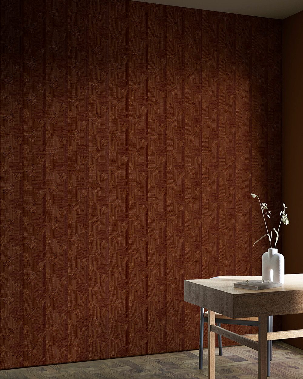Because of its strong yet refined design, this wallpaper pairs well with neutral furnishings, dark woods, and minimalist décor. It works beautifully in living rooms, dining areas, creative studios, and contemporary workspaces where visual interest is key.