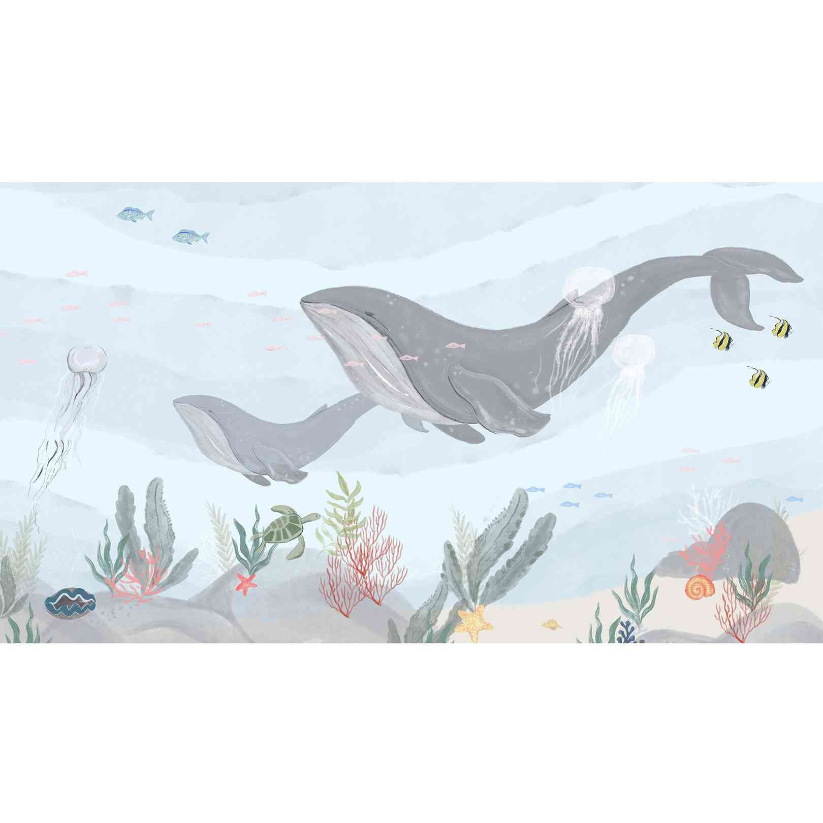 Panoramic Flying Whales by Wall Dreamer takes you on a journey under the sea, where ocean animals swim freely in a calm, dreamlike world. This beautiful underwater wallpaper shows gentle whales gliding through clear waters as bright fish move playfully around them.
