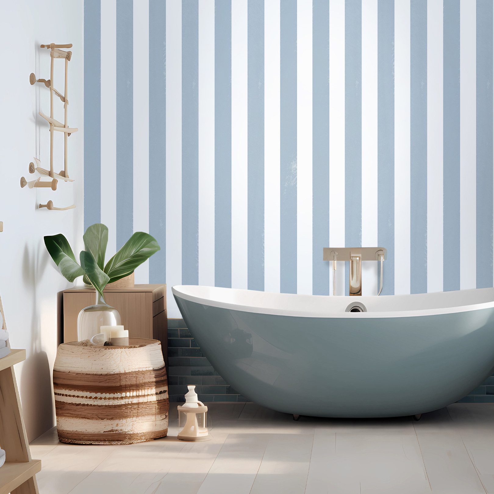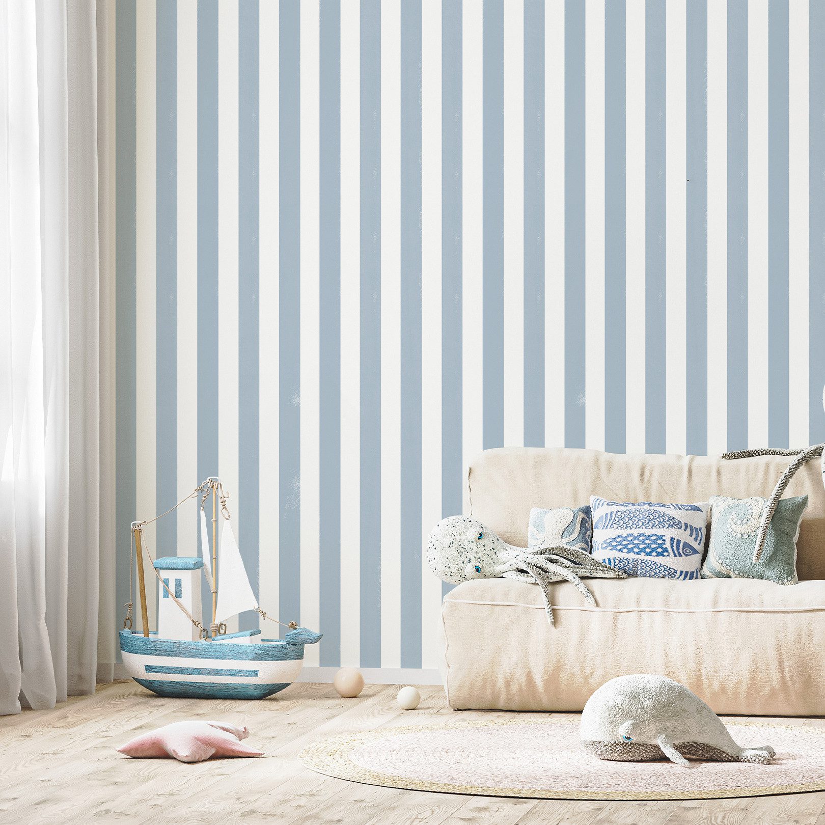 Bring classic elegance into your home with Rayure Vintage Wide Bleu by Wall Dreamer—a refined blue stripe wallpaper that blends nostalgia and modern style. The vertical stripes in soft, faded blue and cream tones create a soothing rhythm across your walls, evoking the quiet beauty of sunlit rooms and timeless interiors.