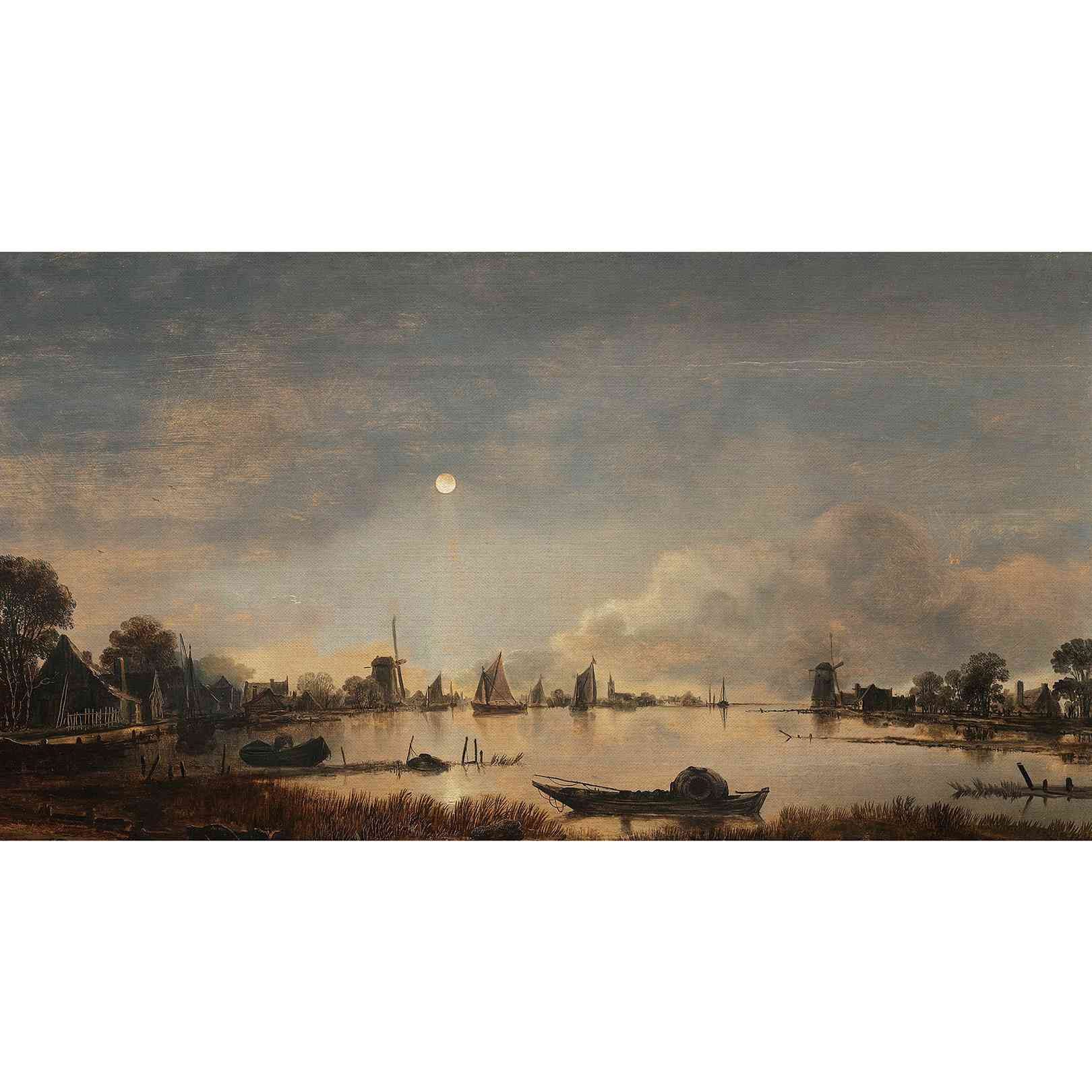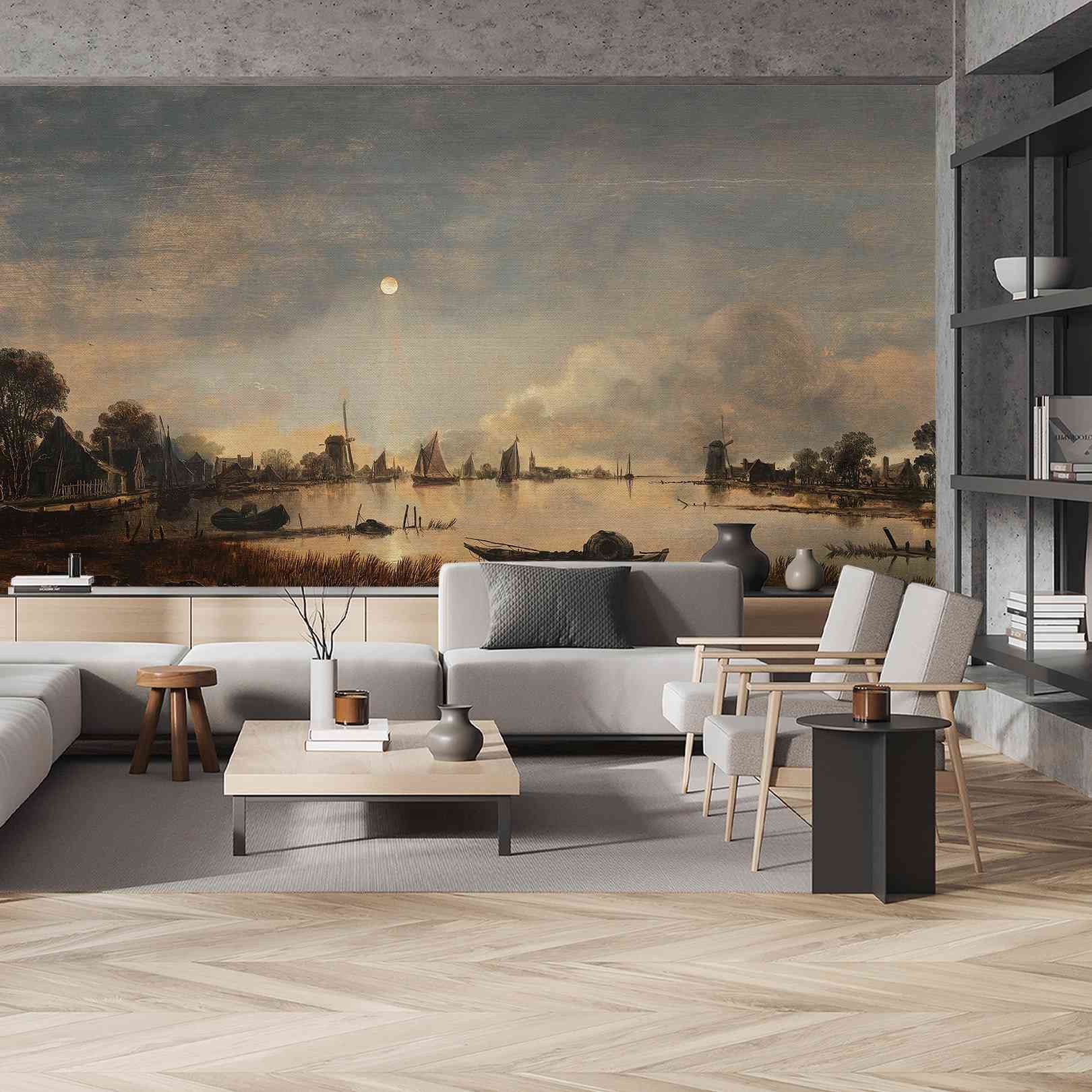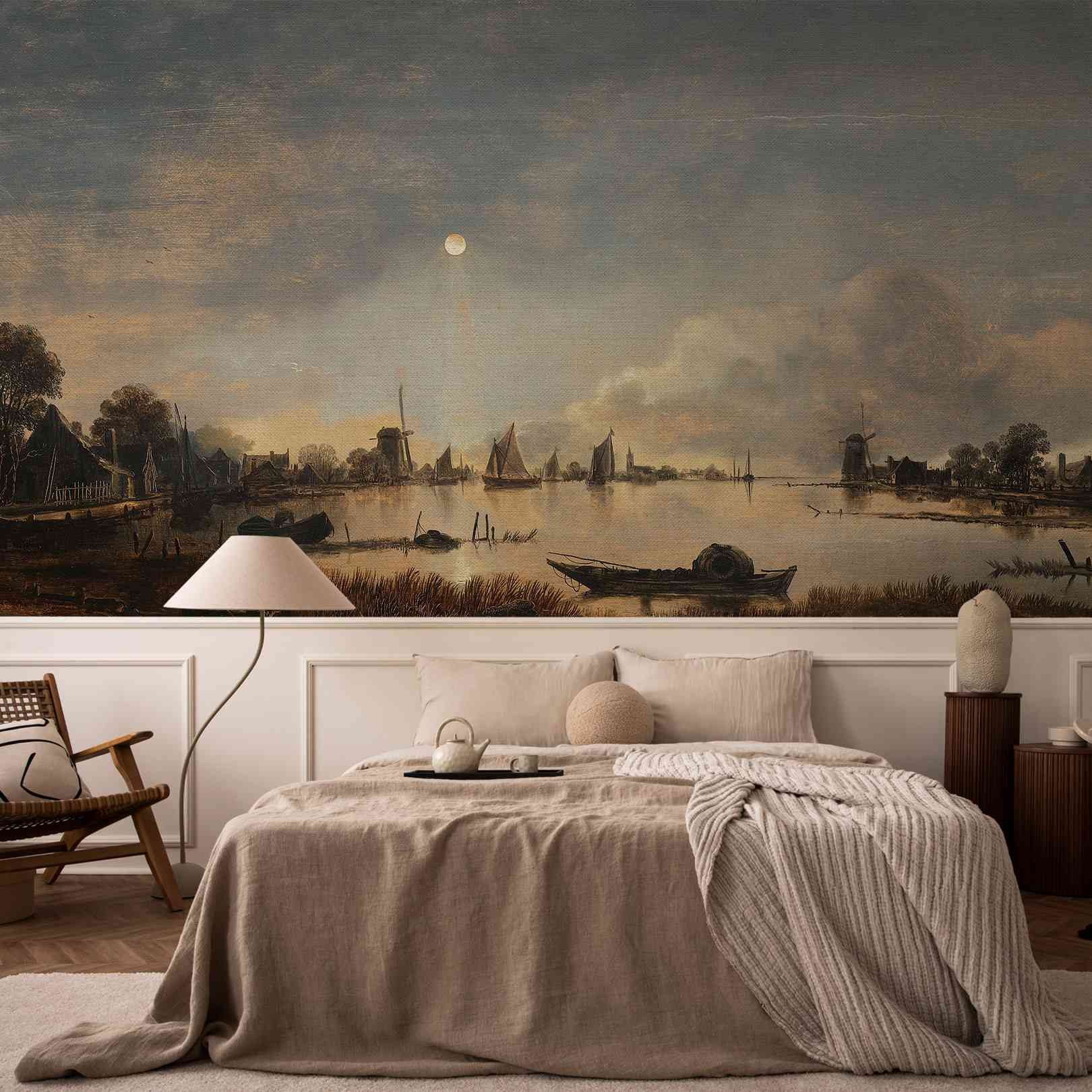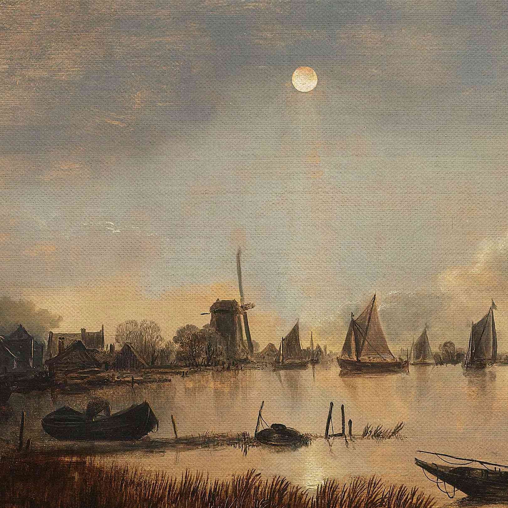 Small boats drift quietly under fading light, while old windmills stand like timeless guardians along the shore. As the sky darkens, a faint moon begins to glow, adding an ethereal touch to this tranquil wall decor. The entire scene invites stillness, escape, and introspection.