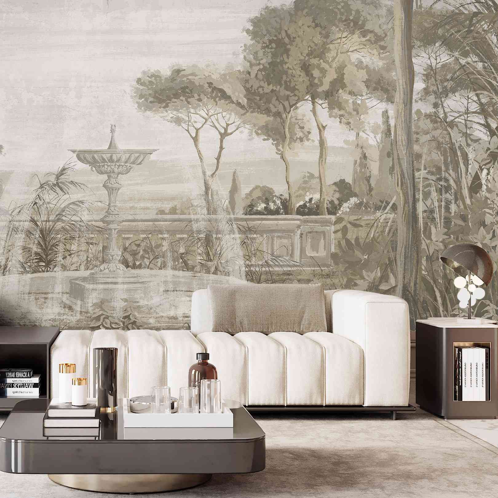 In the foreground, bushes and leaves of various shapes rise up to the sky, like an ode to nature. Ferns and wild plants flourish in a joyful disorder. In the center of the garden, a stone fountain spits out its clear water, creating a soothing focal point. One can imagine the lapping of the water and the singing of the birds nesting in the surrounding trees contributing to the peaceful atmosphere of the place. Behind the fountain, a stone balustrade marks the boundary of the garden. Beyond, large trees with majestic branches rise up to the sky, creating an impression of depth and mystery.