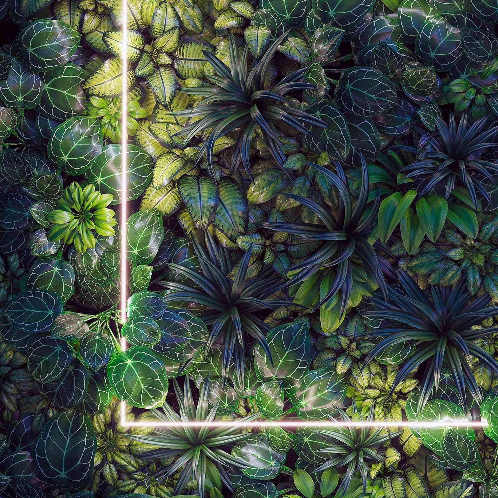 Lush leaves frame a softly illuminated center, mimicking a glowing panel within a vibrant plant wall. The delicate yellow neon-style light casts a warm, ambient glow, perfect for unwinding in the evening. Whether installed in a living room, bedroom, or wellness corner, the effect is grounding and atmospheric.